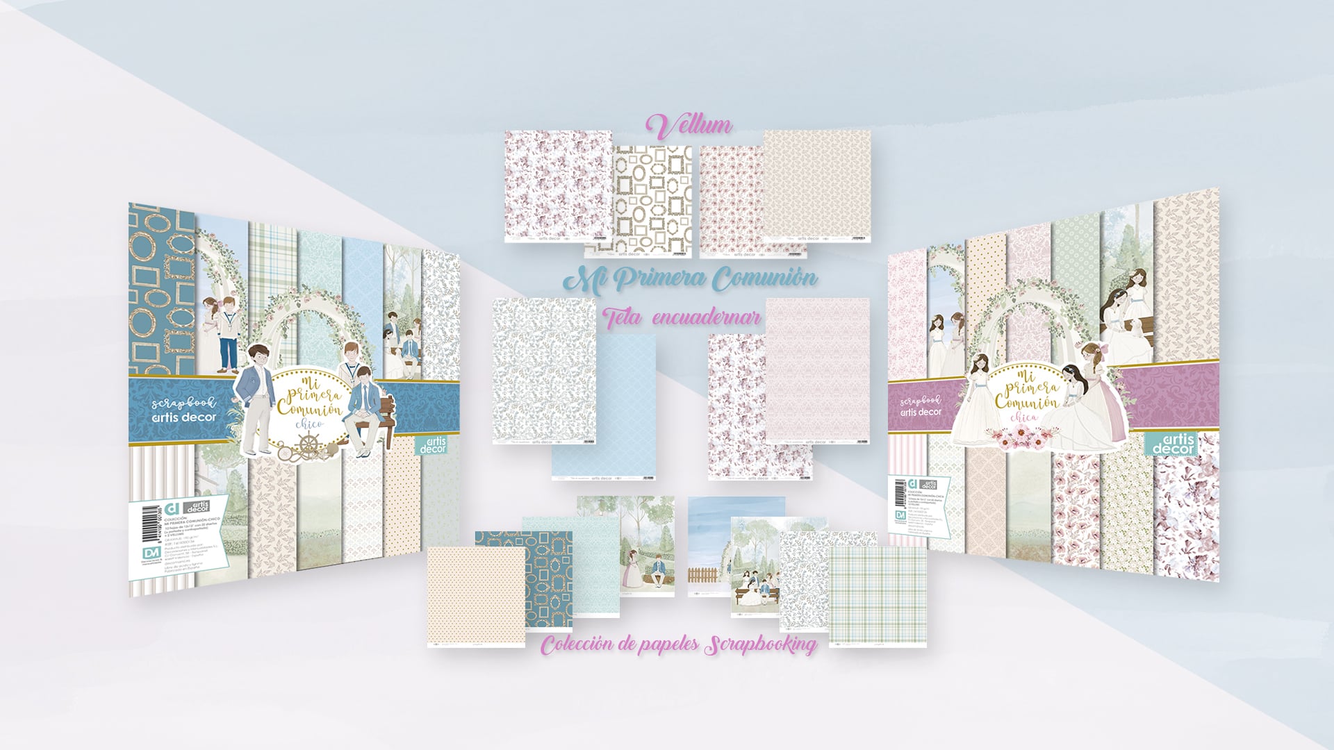 La nueva colección "Mi Primera Comunión" es una colección de scrapbooking muy completa y viene acompañada de Vellum y Tela de encuadernar.